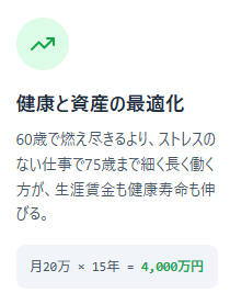 正解は、「ストレスのない仕事で、細く長く(70歳〜75歳まで)稼ぎ続けること」です。月収が20万円でも、それが10年、15年と続けば、生涯賃金は3,000万円〜4,000万円になります。これは、50代で無理をして年収を維持し、60歳で燃え尽きるよりも、はるかに経済的かつ健康的です。
