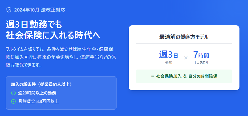 「のんびり働く」を実現する上で、絶対に知っておくべき制度変更があります。それが2024年10月から拡大された「社会保険の適用範囲」です。この制度改正は、50代のダウンシフトを強力に後押しする追い風となっています。