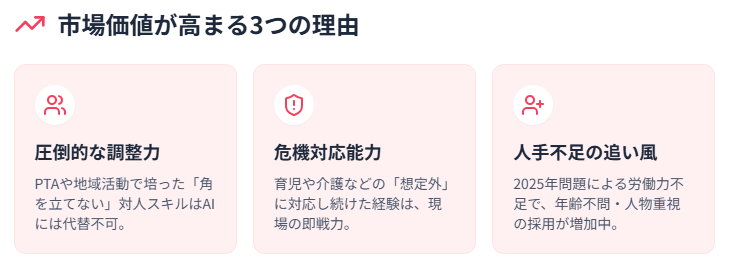 この高度なソフトスキル(対人能力)こそ、AIには代替できない、企業が喉から手が出るほど欲しい能力なのです。若手社員が「ムリです」「パワハラです」と言って辞めてしまう場面でも、あなたは冷静に状況を分析し、落としどころを見つけられる。この「大人の対応力」は、20年間の人間関係の中で培われた、あなたにしかない財産です。