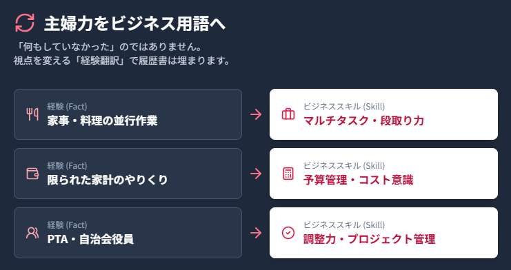 では、具体的にどうアピールすればいいのでしょうか。履歴書の自己PR欄に「家事を頑張りました」と書いても、面接官には響きません。ここで必要なのが、主婦の言葉をビジネスの共通言語に変換する「経験翻訳」です。