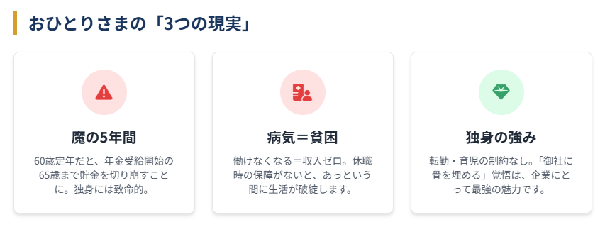 会社選びの前に、私たちが直面している現実を直視しましょう。敵(リスク)を知らなければ、正しい城(会社)は選べません。60歳定年による収入減、病気による収入ゼロのリスク、そして独身女性ならではの強み。この3つの要素を正確に理解することが、最適な会社選びの第一歩となります。悲観する必要はありません。あなたには、既婚者にはない大きなアドバンテージがあるのです。