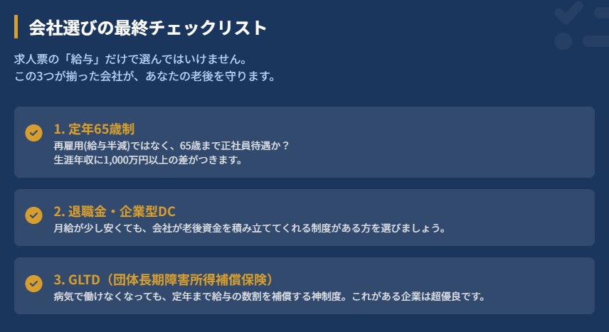 目先の月収よりも、「65歳まで安心して働ける環境」と「病気時の保障」を最優先してください。具体的には「定年65歳制」「退職金・企業年金」「GLTD(所得補償保険)」の3つが揃った会社を選ぶことが、老後貧困を回避する鉄則です。月給が少し安くても、福利厚生が充実している会社の方が、生涯年収は高くなります。