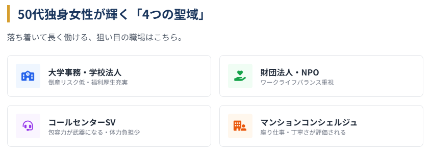 学校法人・大学事務、公益財団法人・NPO事務局、コールセンターSV、マンションコンシェルジュなどが狙い目です。これらは福利厚生が充実し、50代女性の落ち着きや事務処理能力が高く評価される「聖域」です。ガツガツした営業ノルマがなく、穏やかに長く働ける環境が整っています。