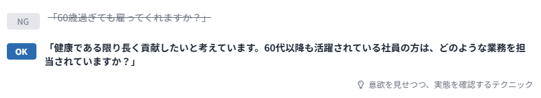 ○ OK: 「私は健康である限り、長く御社に貢献し続けたいと考えています。現在、60代以降も活躍されている社員の方は、どのような業務を担当されていますか?」