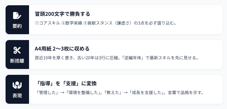 成功の鉄則は、①キャリアを要約しA4用紙2~3枚に収める(断捨離)、②「指導・管理」という言葉を「支援・育成・貢献」に変換する(謙虚さ)、③直近の実務能力(プレイングスキル)を強調することの3点です。
