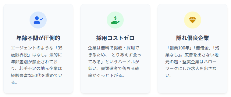 エージェントの求人は「35歳まで」「40代前半まで」という暗黙の年齢制限がありますが、ハローワークは法的に年齢差別を厳しく禁じています。もちろん実態としての選別はありますが、地元の中小企業は「若手が来ない」ことを痛感しているため、「50代でも元気なら採用したい」という現実的な経営者が多いのです。