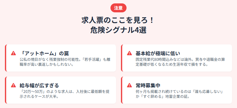 4つの危険シグナルをチェックしてください。①「アットホーム」「若手活躍」などの抽象的な言葉が多い、②固定残業代80時間など基本給が極端に低い、③「月給20万円〜50万円」のように給与幅が広すぎる、④数ヶ月間ずっと掲載されている「常時募集中」の求人。これらに該当する求人は避け、具体的な業務内容が淡々と書かれた求人を選びましょう。窓口で採用・離職履歴を確認するのも有効です。
