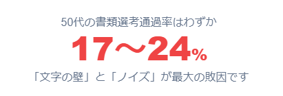50代の書類選考通過率は約17〜24%と厳しい現実があります。多くの書類は「年齢」と「読みづらさ(情報過多)」で弾かれています。30年分の経歴を全て詰め込んだA4用紙5枚の大作は、人事担当者に多大なストレスを与え、30秒で不採用となります。数打ちゃ当たる戦法は通用しません。書類の質を高めることが唯一の突破口です。